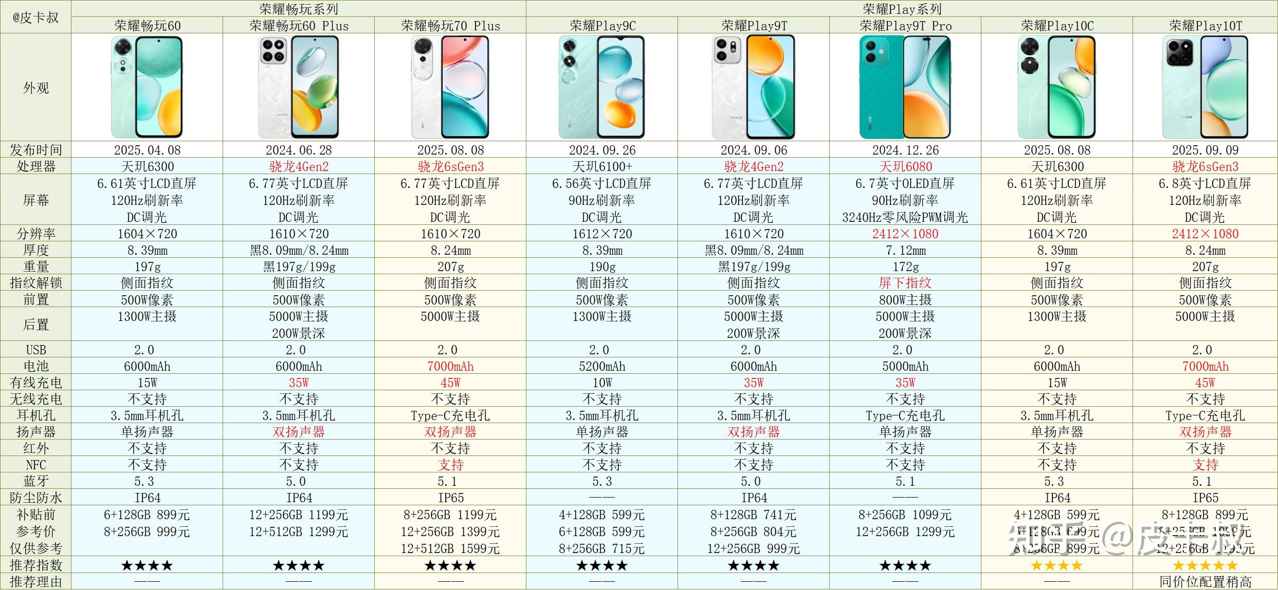 畅玩系列定位比X系列低,没有太推荐的机型。荣耀Play系列有很多机型与X系列和畅玩系列配置相似,但价格相对便宜一些。