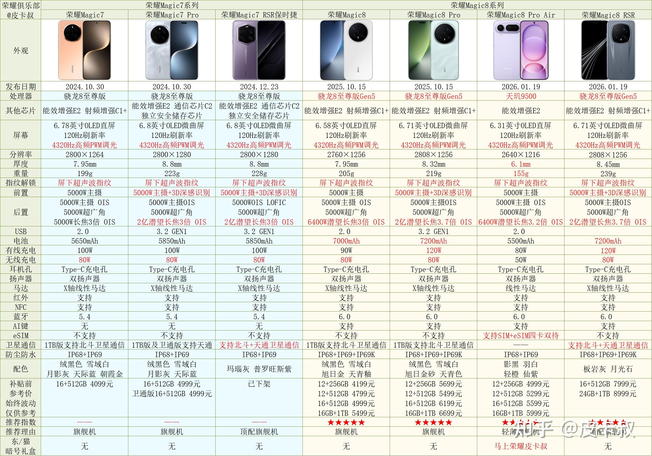 荣耀Magic系列参数对比如下: