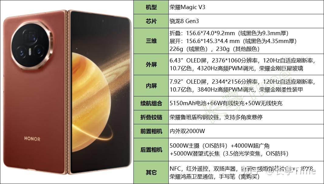荣耀Magic V3兼顾轻薄机身、主摄级潜望式长焦、50W无线充电、卫星通信于一体。