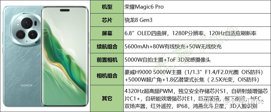 荣耀Magic6 Pro各方面配置比较均衡且旗舰,尤其在护眼、耐摔、续航、信号、长焦、卫星通信等方面比较不错。