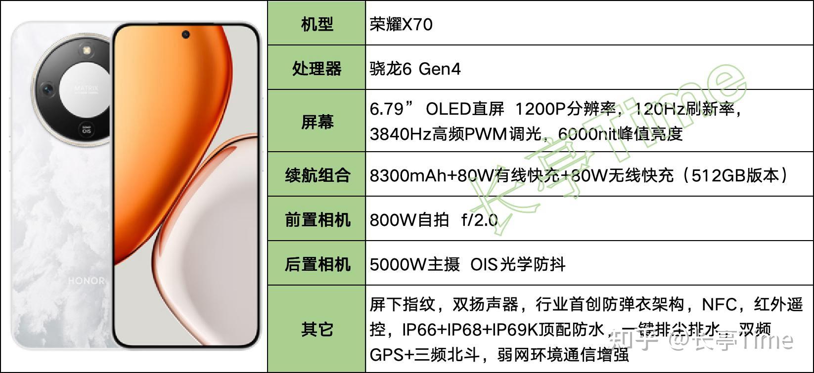 - 搭载3D超声波指纹、荣耀巨犀玻璃,支持IP68+IP69防尘防水,在防护和安全方面极具优势。