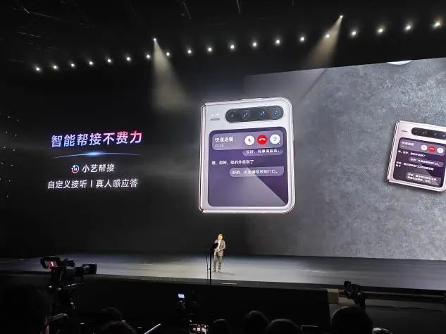 发布会现场,余承东从口袋掏出这款手机,折叠起来,就变成小手机,正面和背面都有屏幕。它还能扩屏使用,横过来用就像平板一样体验。