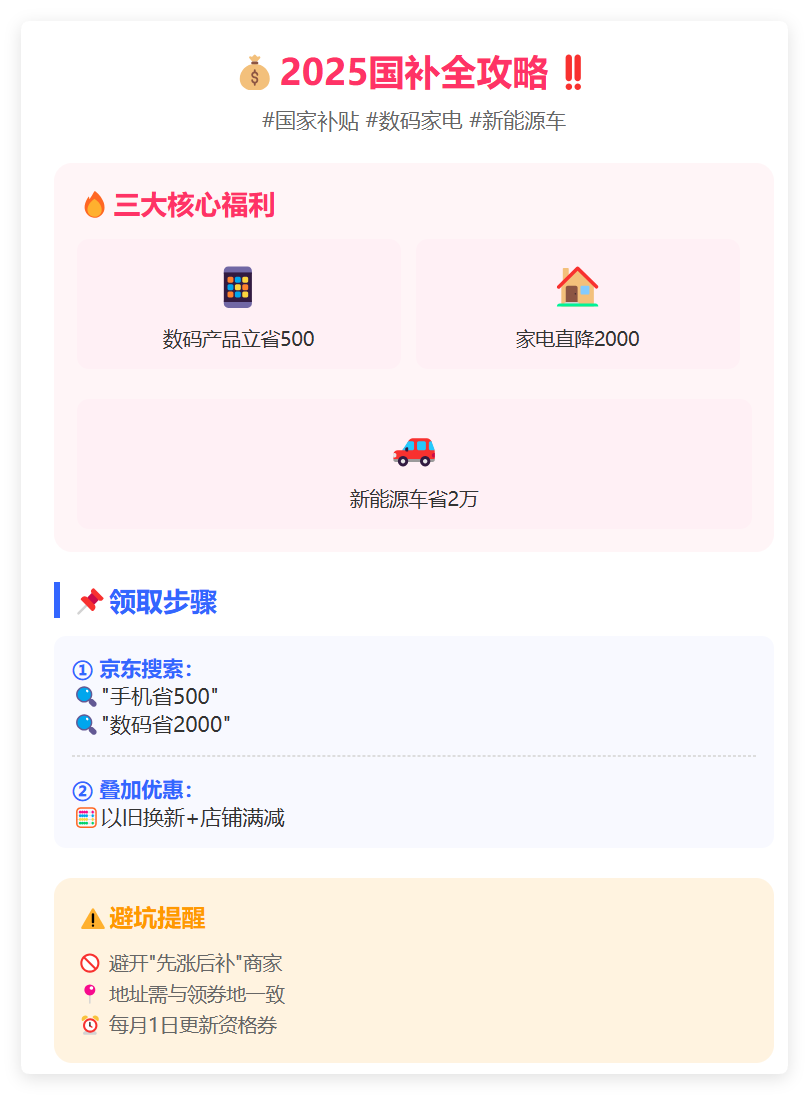2025国补是近五年力度最大的普惠政策,政策有效期至12月31日。建议优先购买3333元以上的数码产品、一级能效家电及新能源车,享受满额补贴。立即打开京东搜索“数码省2000”,锁定年度省钱机会!