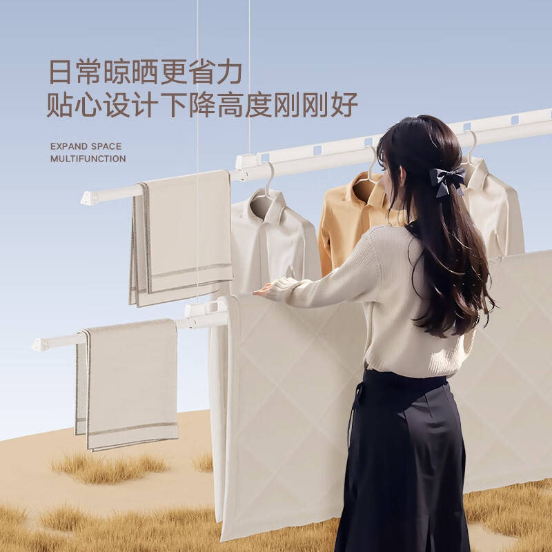 这款晾衣架不仅支持智能升降,还具备紫外线杀菌功能,有效保护家人的健康。其铝合金材质增强了耐用性,并倡导环保家居理念。设计上,纤薄的机身不占用阳台空间,适合现代家庭的需求。